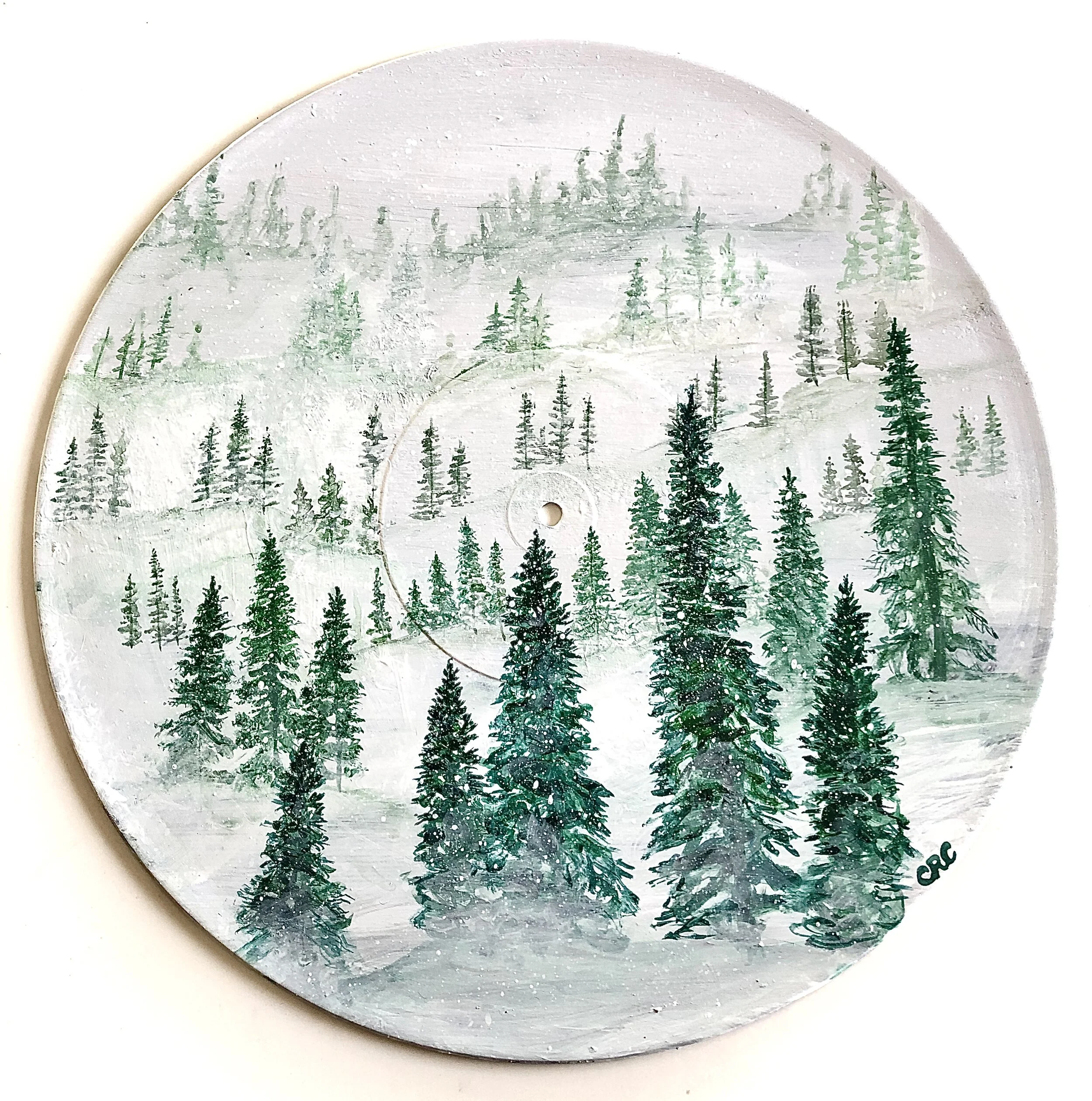This painting is an original idea and concept by Calynn Rose. This painting is done on a scratched vinyl record. Instead of throwing it away, it has been transformed into a beautiful piece of art. This winter scenery would be a great addition to your collection. I recommend hanging this piece on a wall with a command strip or a tac through the hole.